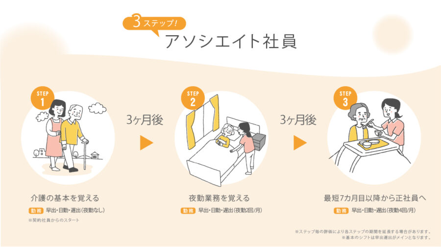 未経験やブランクがありながらも正社員採用を望まれる方が、まずは日勤のみ(夜勤なし)で安定した月給を得ながら業務を習得し、正社員登用を目指せる制度です。